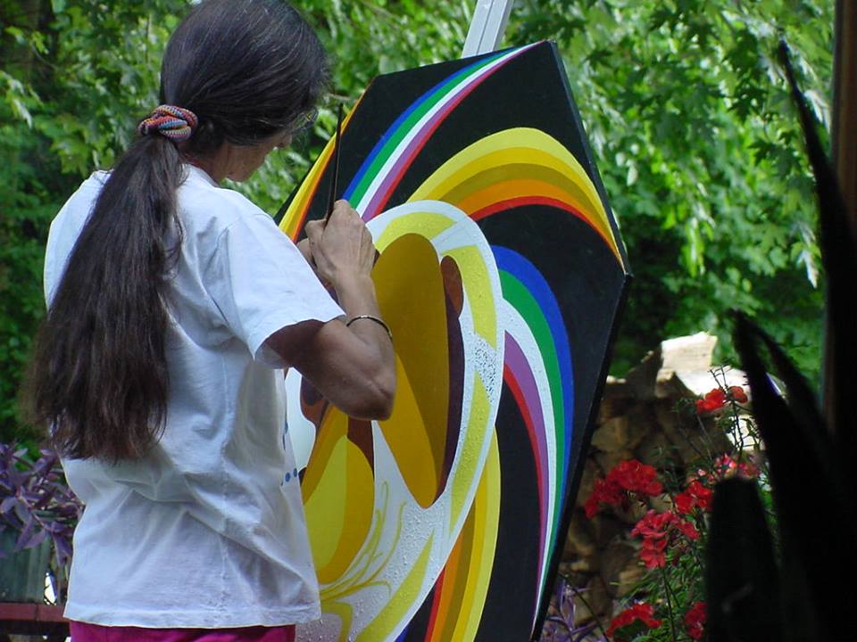 As a result of my appreciation for Mandala images, many of my paintings are circular in shape, My design are abstract and usually consist of elliptic lines and repeating patterns. The center of the painting may consist of a human figure. The colors of my paintings are always strong, bright, bold and texture is occasionally added.